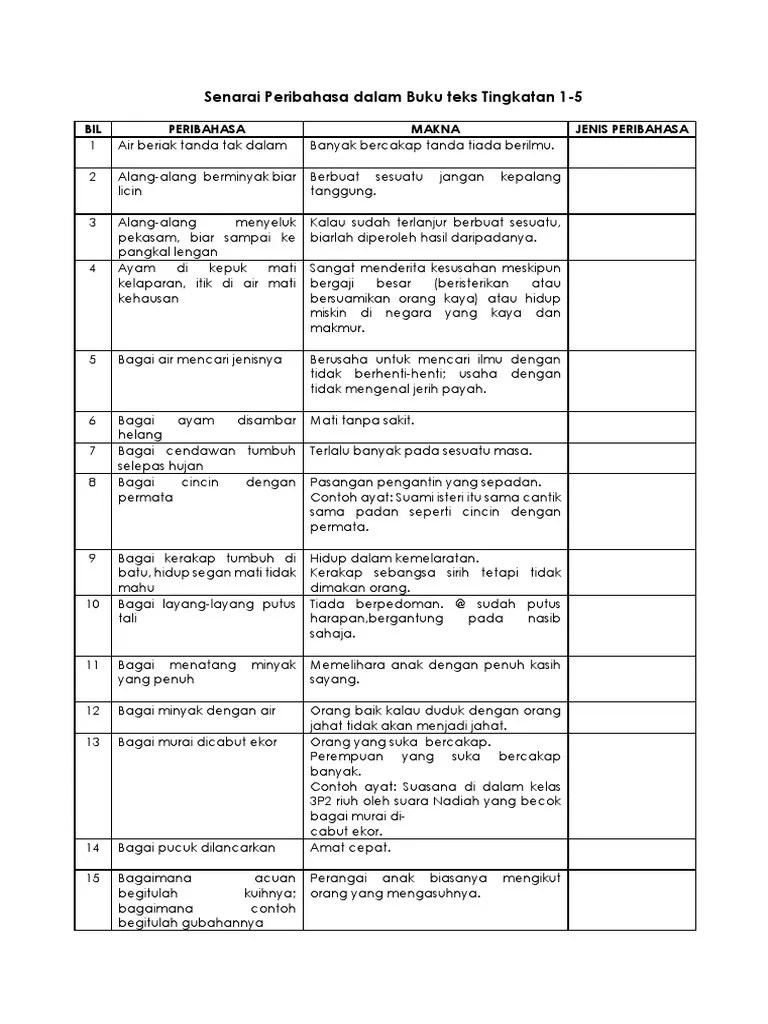 Suami isteri itu sama cantik sama padan seperti cincin dengan permata. Siti yang bercakap bagai murai tercabut ekor itu telah didenda berdiri di atas kerusi kerana membuat . Bagai kerakap tumbuh di batu,. Semua penduduk kampong seri pinang bergotong royong membersihkan kawasan kampong mereka, bak kata pepatah ringan sama dijinjing, .